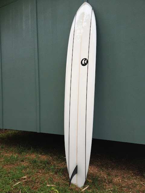 We just made a couple copies of our friend Chris's 10'6" Skip Frye Eagle. We don't usually do copies of Trademark models of other brands... but it's hard to get a proper copy of that particular model out on this rock I hear. We had to wait a bit for the custom blanks to come in, but the finished product was worth it. Check out those Redwood side stringers. With Redwood, sometimes it comes really light and looks like cedar after it's glassed. But other times it comes in a much richer, almost black color. Always a roll of the dice, and it came up a winner on this board!