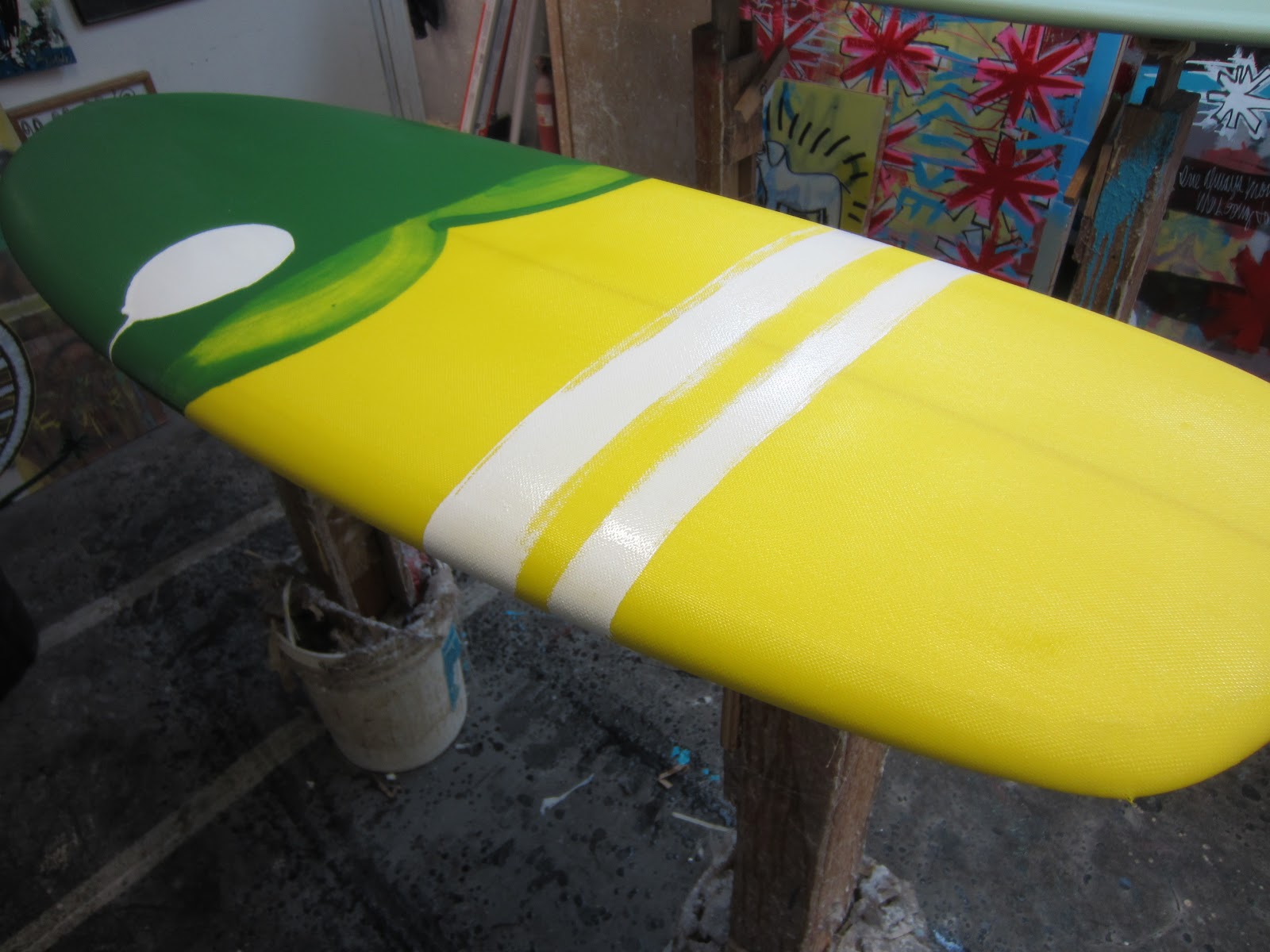Here I am sanding off a doodle I did on one of the resin pieces. This piece sat around the shop for ages with a Posca drawing of Rainbow bridge in Haleiwa. I thought at the time I might be able to sell something like this. I ended up getting over the idea, sanding it, and adding another sequence of colors.